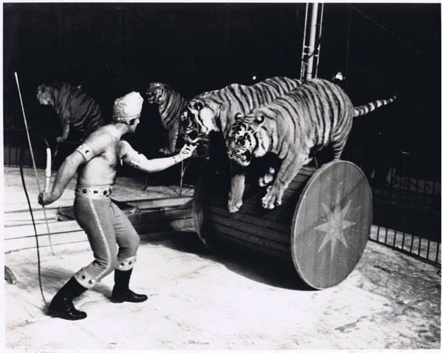 Thankfully, the era of the ‘Big Cat Circus Show’ is largely coming to an end. Here is a spectacle which can boast no purpose or evolution beyond the thrill of danger - the palpable frenzy of wild animal power pitted against defenseless humans, armed only with their wits and accompanied by the absurd and flimsy trappings of costume and routine. Enslavement? Domestication? Man as master of the world of nature? The whip cajoles rather than commands, the trainer - ever conscious of his hapless state, belies the fact in his bearing no matter how bold the gesture. And then there are the attacks - the stories and lessons of which undoubtedly blazed in the minds of trainers and spectators alike when confronted by these gargantuan predators. Ultimately, and tragically, it was these lesson alone - taught into the bodies of far too many talented and well-meaning men - that finally put an end to the profession of the “Lion Tamer.”