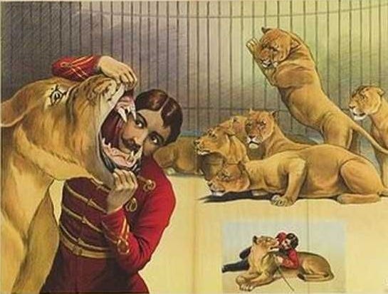 The later criticized and abandoned methods were initially hailed and widely imitated - Louis would literally ‘rattle the lions’ cages and tease them into exhaustion.’ He timed this rough medicine with feeding, exercise, and sleep schedules so as to condition his subjects to accept the futility of acting out in the course of their performative routines. Twentieth Century analyst, Gerard Barre, states - ‘La Tour wished to impose the factory life on his lions - for a period of time he succeeded - they punched in their time on the clock, ate, slept, and went to church all on a schedule - then one day the jungle re-awoke within them.’