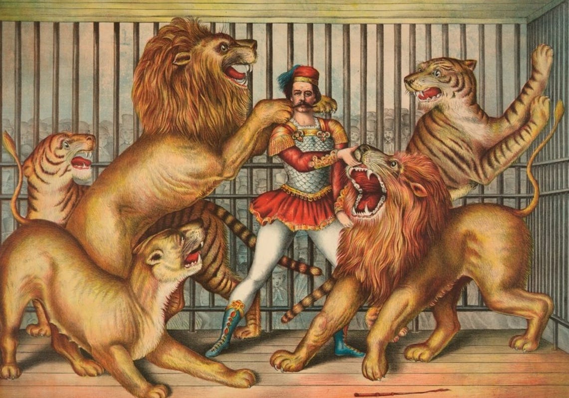 Samson and Sanson were wheeled in in separate cages from opposites sides of the ring, roaring and hissing at the height of aggressive agitation. Driven wild by the heat and the palpable funk of angry men’s souls their tails twitched, eyes and teeth flashed, making every gesture one of explosive release from what consumed them from within. Their focus was entirely on la Tour. In no uncertain terms - their menacing announced that they were not to play games this day - these were twin kings of the jungle and done doing the taking.